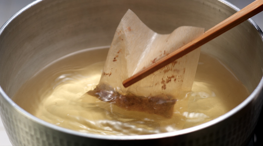 全体に水が染み込むよう、箸で袋を揺らすのがポイント。弱火で加熱すると上品に、強火だとやや濃い目に仕上がります。焼きあごの上品な風味を生かして、おうちで本格和食をお楽しみください。