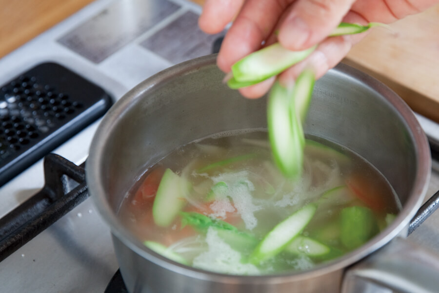 ① 鍋に[A]を入れ火にかけ、沸騰後中火で4〜5分煮出す。