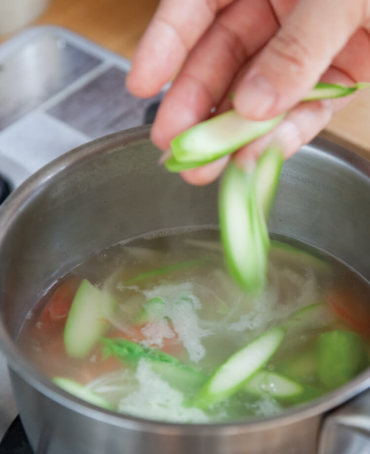 具材は玉葱、じゃがいも、アスパラ。根菜たっぷりでも、薄切りにすれば煮込み時間を短縮できます。鶏だしとじゃがいものやさしい調和は、朝にもほっとする味わいです。