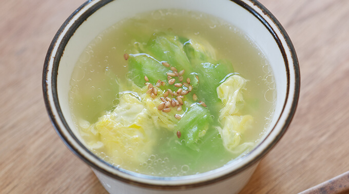朝に摂りたい食材、卵と野菜を使ったスープです。包丁いらずで、たった数分で完成。ふわふわ卵に鶏だしのやさしい味わい、胡麻の風味も添えています。