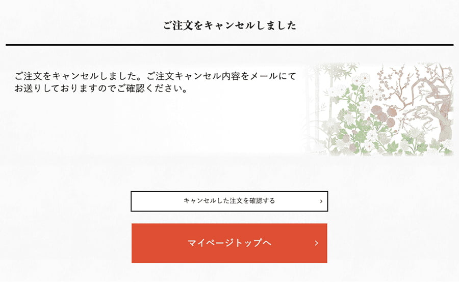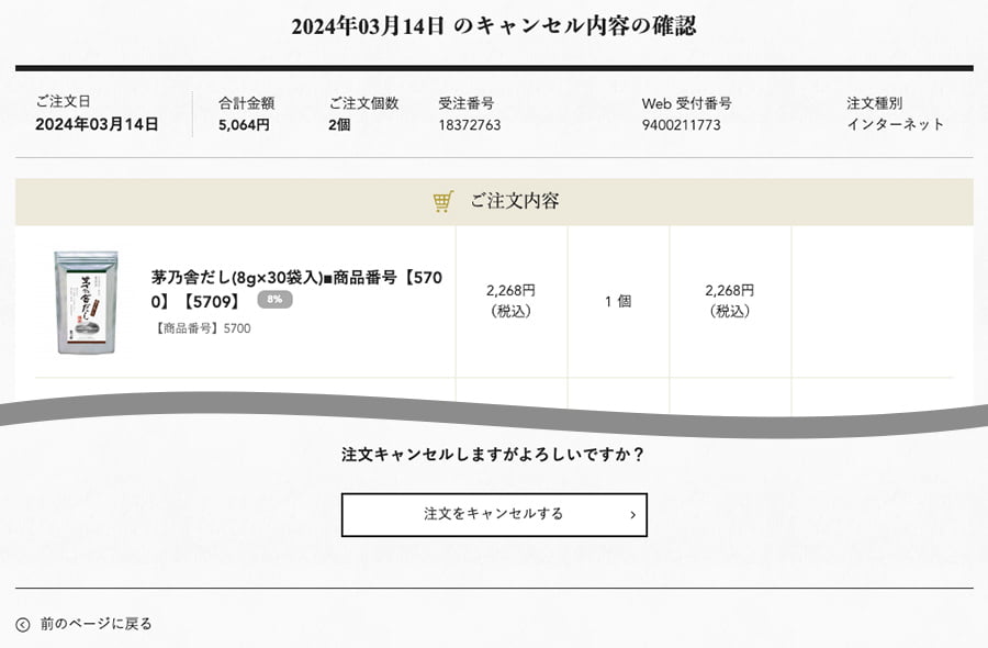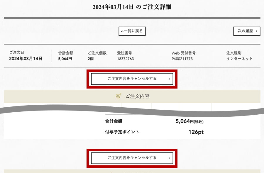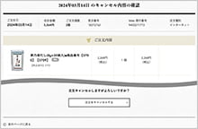 [キャンセル]画面で変更いただいた内容をご確認ください。内容に誤りのある場合は[前のページに戻る]を押していただき訂正をお願いいたします。内容がよろしければ[注文をキャンセル]ボタンを押してください。[変更完了]画面に移ります。