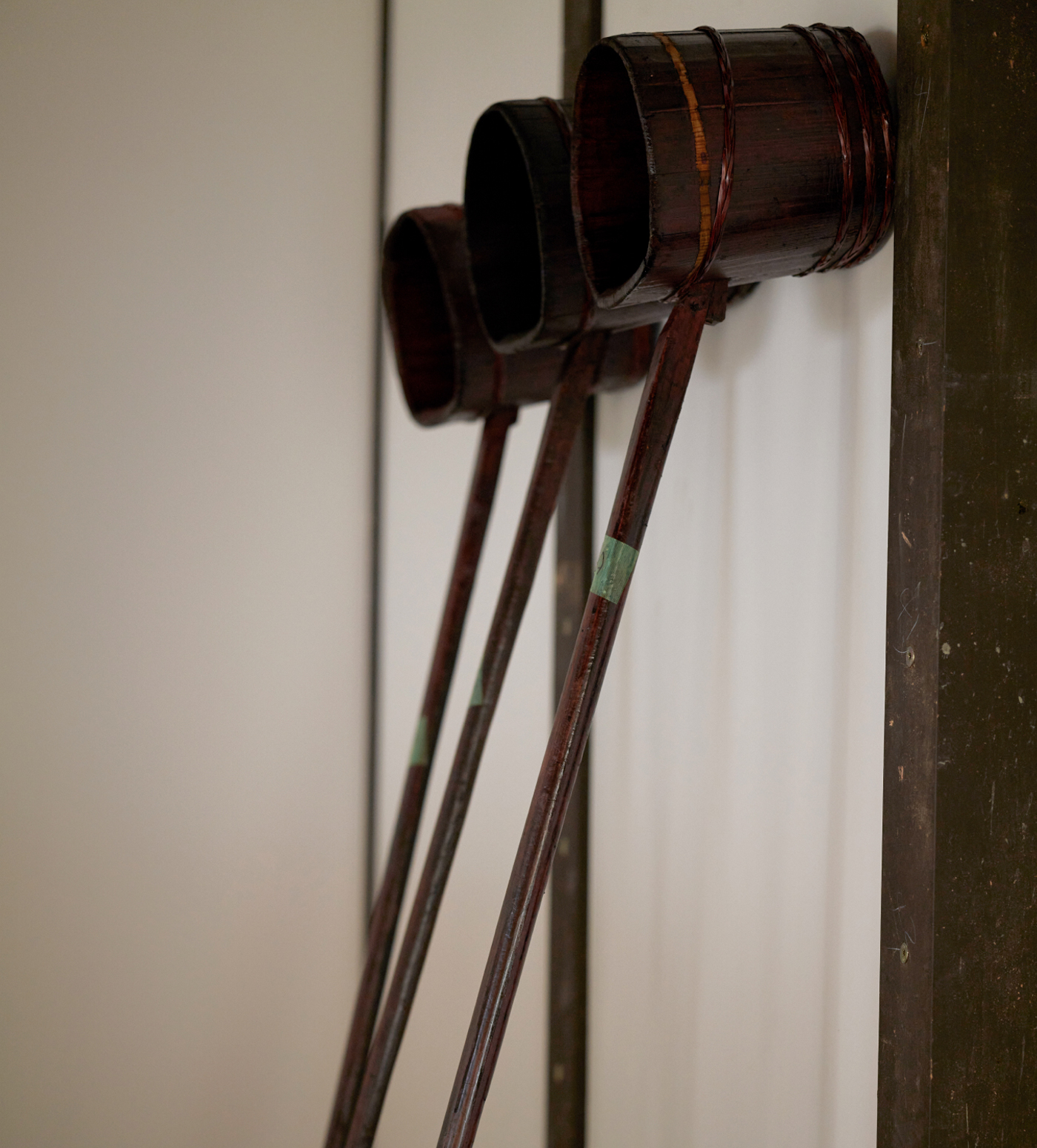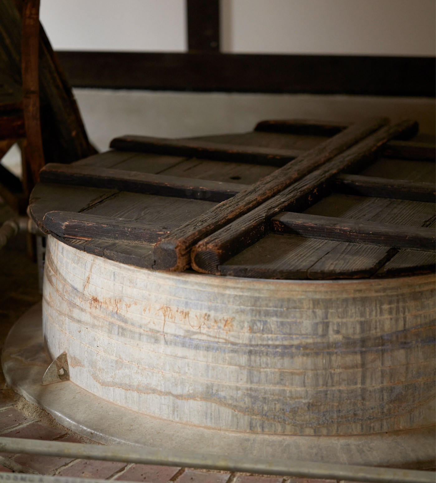 伊豆本店では、つい近頃まで、昔ながらの「槽搾り」という手作業の製法を採用していました。搾りは、日本酒と粕に分ける酒造りの最後の工程。槽搾り製法とは、発酵を終えたもろみを目の粗い酒袋に入れて、“槽(ふね)”と呼ばれる道具に積み重ね、もろみの自重で自然と酒を絞り出す方法。その後、重しをおいて、酒を搾り出します。