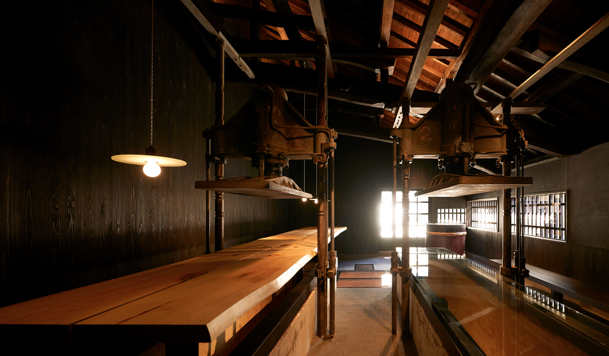 熟練の技もいる槽搾りは、手間と時間がかかりますが、できあがった酒はまろやかになり、酒粕も柔らかくおいしくなります。再興にあたり、「槽搾り」製法から設備が変わりますが、伊豆本店が大切にしてきた精神を伝え続けるため、その設備を「酒蔵BAR」のカウンターとして再利用しています。