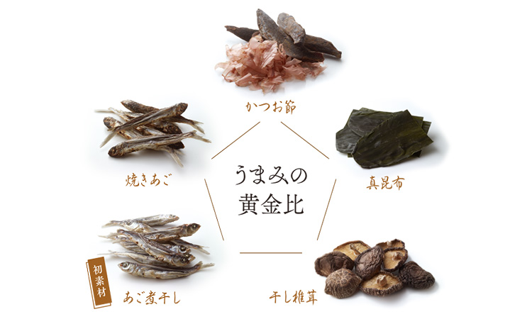 日本の3大うまみと呼ばれるかつお節、昆布、椎茸。そこに九州ならではの「焼きあご」と「あご煮干し」を足し、味の深みを極めました。それぞれの素材の良さが生きる“黄金比”で掛け合わせることで、うまみが格段に上がります。