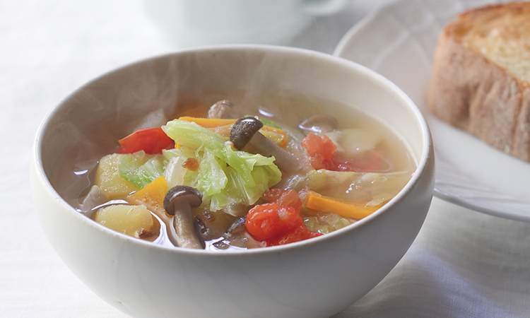 冷蔵庫の野菜をざくざくっと切って、袋を破った野菜だしと一緒に煮るだけで、うまみたっぷりのスープに。