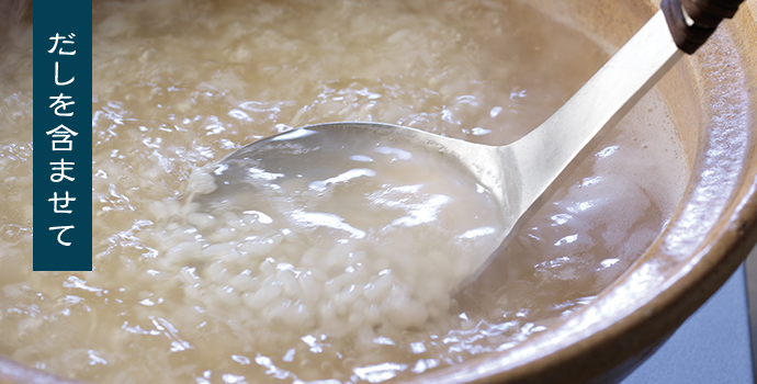 おいしいだしで仕上げると、たいへん上品な雑炊に。お米一粒一粒によく含ませます。