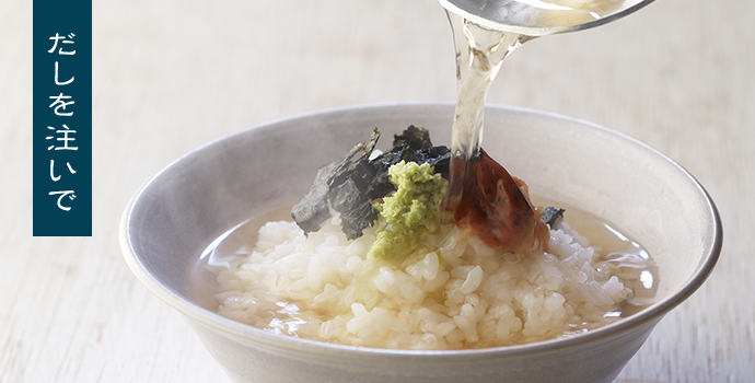 シンプルに味わうなら、まずは梅、わさび、海苔などで。煮出しただしをそのまま注ぎます。もちろん、鯛や鮭などお好きな具材でもお楽しみいただけます。