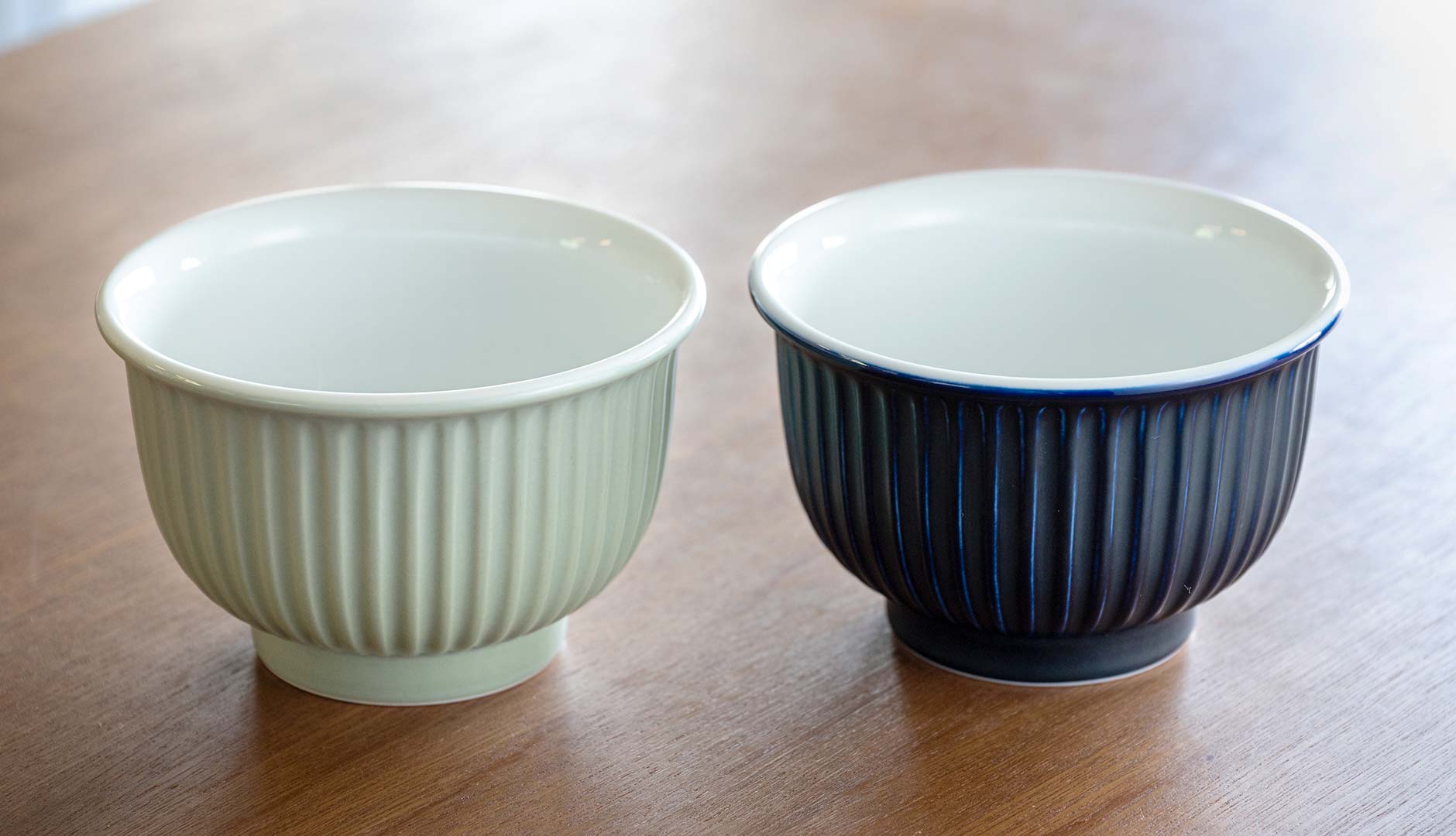 料理を引き立てるのは透明度の高い白。きめ細かな陶土を練り上げ、1350℃で還元焼成したことで生まれた清々しさです。色は瑠璃と青磁の2色があり、こちらも深川製磁独自の焼成技法のたまもの。家族それぞれお気に入りを選べます。