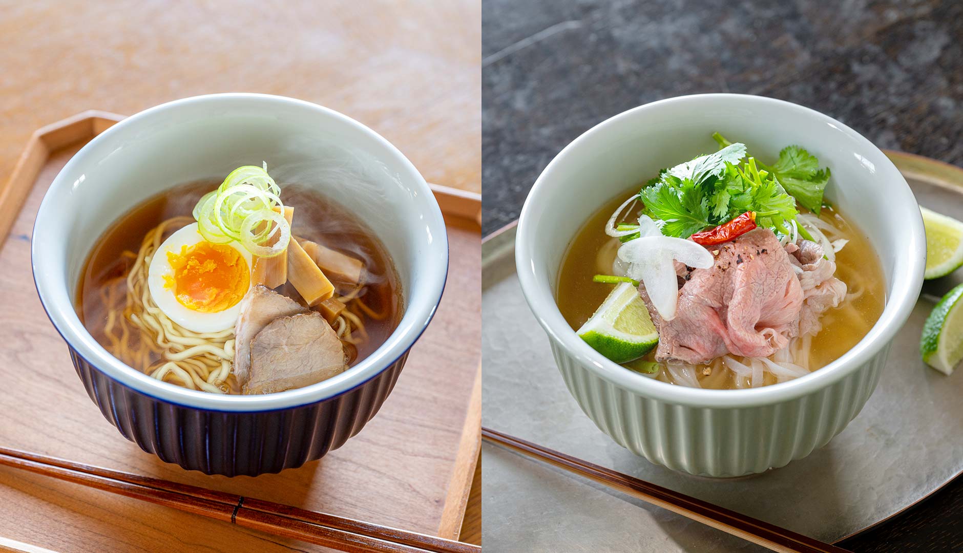様々な料理を優しく受けとめる「青磁」。「瑠璃」は食卓を凛とした表情に。麺類にもご飯ものにも似合います。