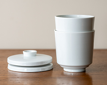 洗練された印象を大切に厚みを抑えてつくりました。容量は約260mlです。温かな風合いの白磁は佐賀・伊万里、程よくマットな質感の鉄黒は佐賀・有田にて、それぞれ窯元の得意をいかして作陶しました。