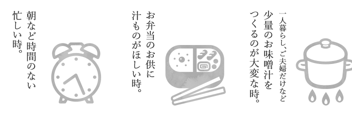 だし、味噌、具材の相性にこだわった味噌汁や、野菜だしベースの洋風スープなど、多彩な味わいが揃いました。お好みやお料理に合わせてお選びください。