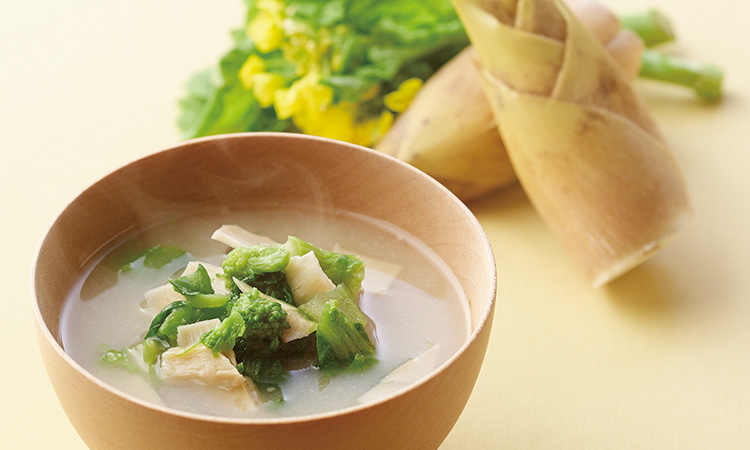 食卓に春が咲く、季節のお味噌汁。菜の花としゃきしゃきの筍を具材に使った、春の喜びが詰まった一杯です。