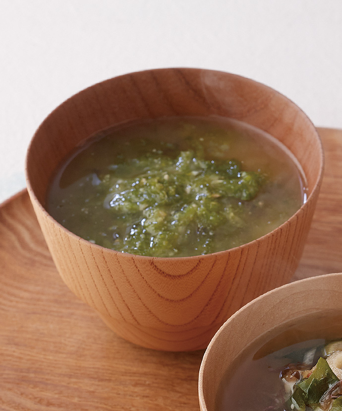 やさしい塩味の「あおさの味噌汁」。「煮干しだし」のしっかりしたうまみが、あおさの風味を一層豊かに。