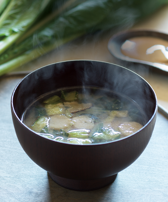 【小松菜とお麩の味噌汁】:1食(標準9g)当たり 熱量36kcal、たん白質1.52g、脂質1.01g、炭水化物5.09g、食塩相当量1.01g