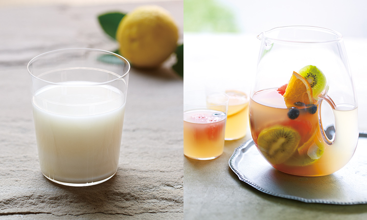 ピッチャーにカットしたお好みのフルーツを入れ、飲む酢ゆず100mlと白ワイン400mlを注ぎます。水割りにすればノンアルコールでもお楽しみいただけます。
