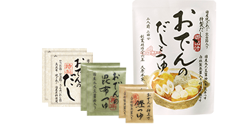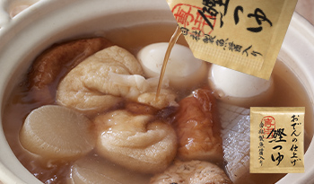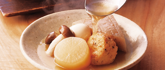 おでんづくりで一番むずかしいのは、煮込み時間と味つけのバランス。ご家庭でもおいしいおでんを手軽につくれるよう、「三つの調味」で仕上げるおでんの素をつくりました。