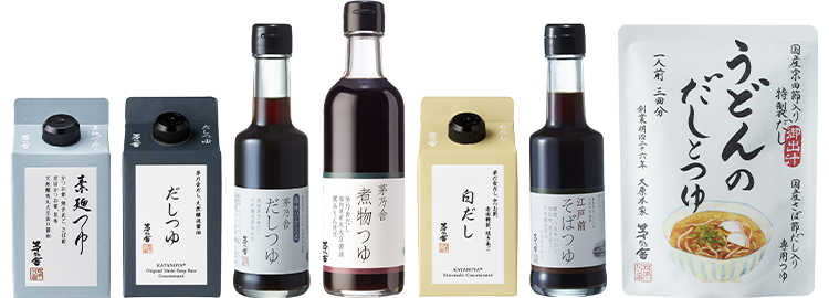 一口につゆと言ってもシーンは様々。煮物や麺、各料理に合うつゆをご用意しました。用途に合わせてお選びください。