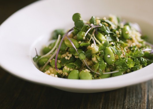 フランスのサラダ料理を、旬の枝豆ときゅうりで。ドレッシングは生七味とすだち、オリーブ油で夏らしく。