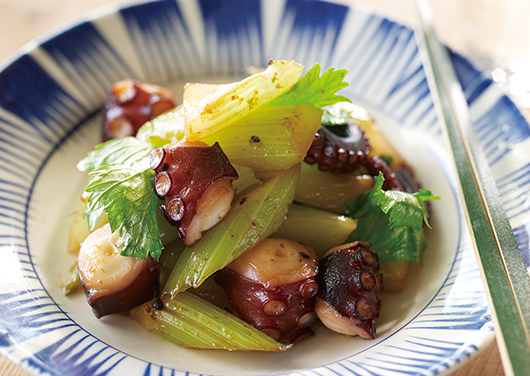 - 2. フライパンに油を入れて熱し、たこ、セロリの茎を炒め、【A】を加える。セロリの葉を加え、さらにさっと炒め合わせる。