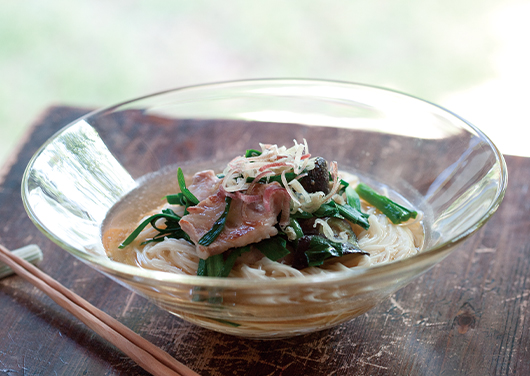 - 6. 4を熱々のうちに素麺の上にのせ、みょうがを散らす。お好みで柚子胡椒や生七味を添える。