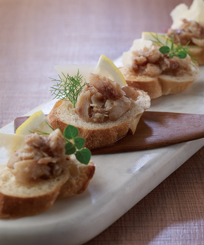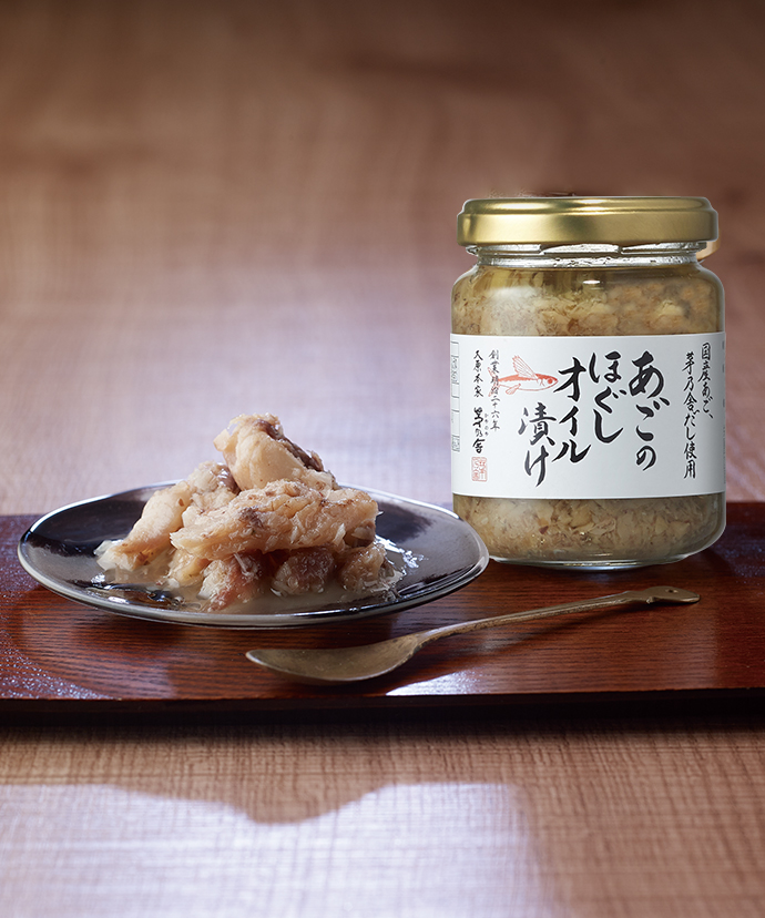 あごの身の“うまみ”を味わっていただきたいという想いから誕生した商品です。あごのほぐし身を、茅乃舎だしで味つけし米油に漬け込みました。