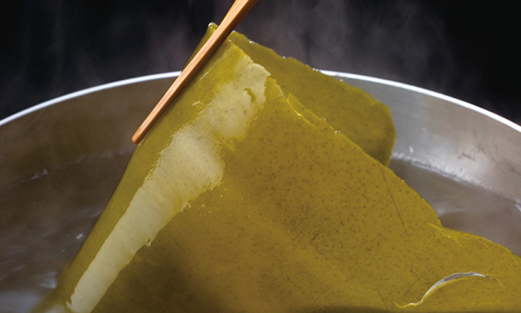 - 2. 沸々と小さな気泡が上がってきたら、かき混ぜながらだしがカリカリになるまで火入れする。香りがたって、オイルの色が濃くなったら火を止め、粗熱を取る。