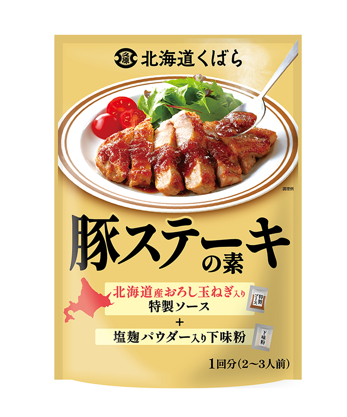 お肉の旨みを閉じ込めて美味しさを引き立てる「塩麴パウダー入り下味粉」と「北海道産おろし玉ねぎ入り特製ソース」がセットになった豚ステーキの素です。お肉の下味をつけずとも、美味しいステーキが出来上がります。