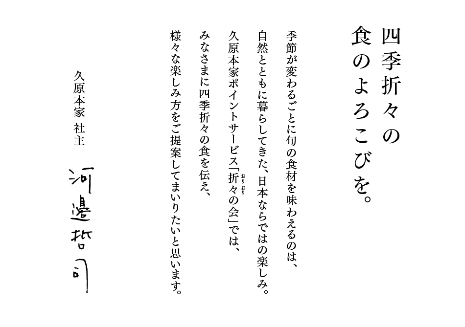久原本家ポイントサービス「折々の会」にご入会いただくと、ネットでのご購入の際、100円(税抜)につき3ポイントが貯まります。貯まったポイントは、マイページ、または久原本家公式アプリよりご確認いただけます。