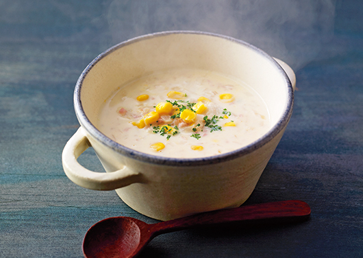 - 1に、野菜だし、牛乳を加えて軽く煮込み、クリームコーンを加えてひと煮立ちさせる。