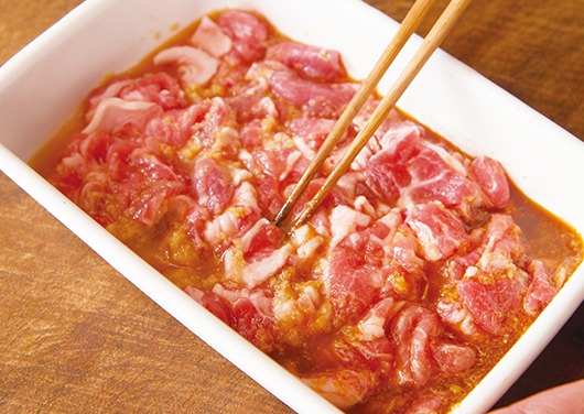 - 【A】を入れた容器に一口大に切った豚肉を入れ、下味をつける(15~30分)。