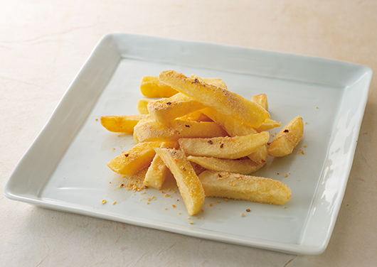 - 180℃に熱した油でポテトを色よく揚げる。