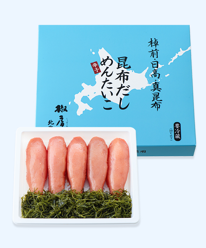 味わい豊かな「真昆布」を細切りにし、めんたいこに添えてお届けします。昆布とたらこにこだわりぬいた匠の味わいです。