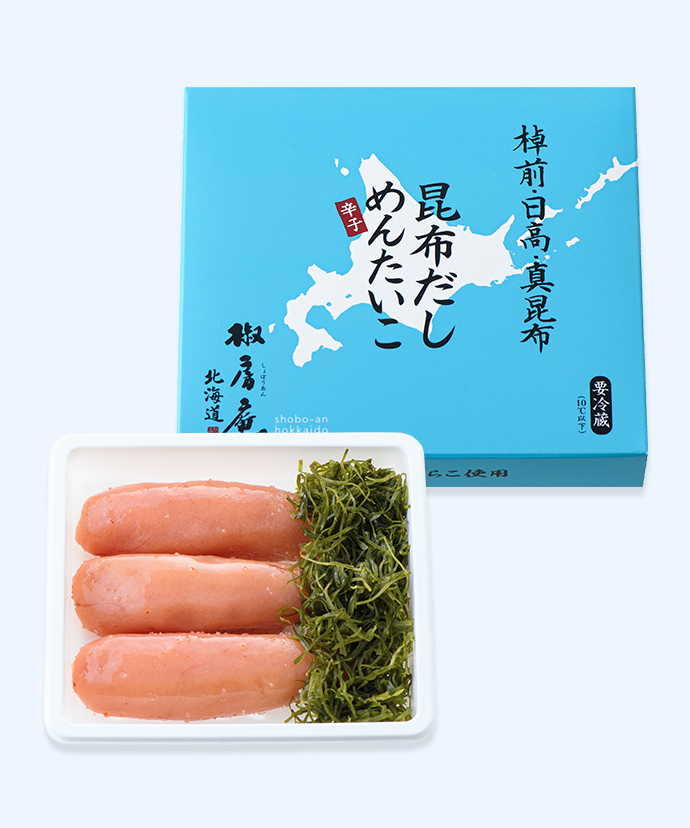上品な香りの「棹前昆布」とコクのあるうまみと淡い甘みを持った「日高昆布」の2種類のだしを合わせて漬け込んでいます。めんたいこの横に添えているこだわりの真昆布と一緒にお召し上がりください。
