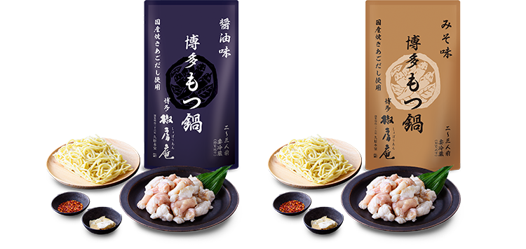 ぷりっと新鮮なもつともつ鍋スープ、〆のちゃんぽんまで入った「博多もつ鍋セット」。ご家庭でキャベツとニラ、豆腐を準備するだけで手軽に本格的な味に。