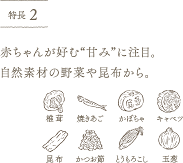 赤ちゃんが受け入れやすいといわれる“甘み”。洋風は、離乳食初期から試せる食材であるかぼちゃや玉葱などの甘み、和風は、昆布や焼きあごの甘みを生かしています。