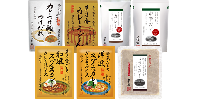 内容:混ぜ込み御飯の素 ドライカレー、カレーつけ麺のつけだれ、野菜だしの洋風スパイスカレー だしとスパイス、茅乃舎だしの和風スパイスカレー だしとスパイス、茅乃舎カレーうどん(1食入)、カレーうどんのカレー、中辛カレー