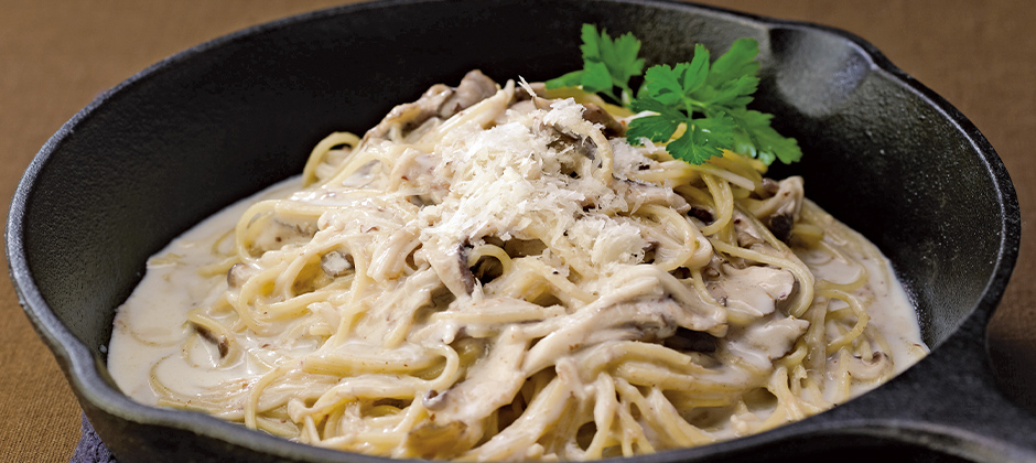 麺に、だしと茸のうま味がしっかり染み込み、食感がモチモチに仕上がります。