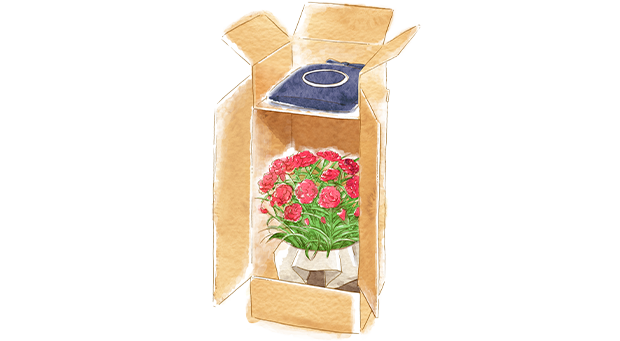 カーネーション(レッド/プラムタルト)と茅乃舎だしのギフトは、お花の上に仕切りを置き、その上にきんちゃくに入った茅乃舎だしを置いた状態でお届けいたします。