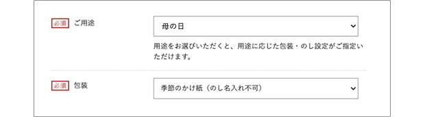 【手順2】[のし・包装設定]ページの[ご用途]項目の[母の日]を選択し、[包装]項目の[季節のかけ紙]をご指定ください。