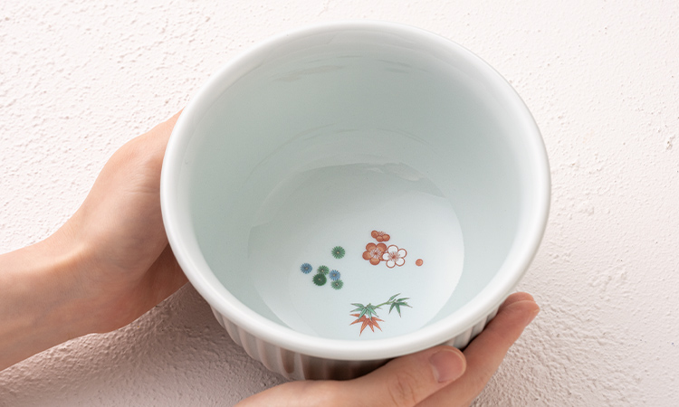佐賀県有田の窯元・深川製磁とおつくりした丼。女性の手にも心地良い形で、年越しそばにぴったりのサイズ。昨年好評をいただいた、限定色の明治釉をまとった丼に、今回はさらに丼の底に松竹梅の絵柄が入る特別仕様でご用意しました。