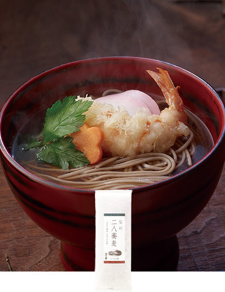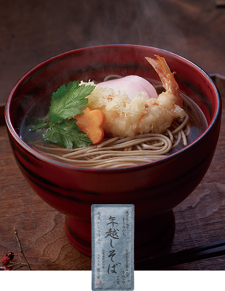 「挽きぐるみ粉」を配合した蕎麦の香りを楽しめる二八蕎麦とだし、つゆをセットにしました。慌ただしい大晦日の締めくくりに、手早く準備できる年越しそばです。