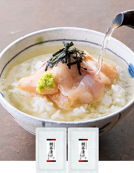 「ごまだれ」と「だし」で二度おいしい「鯛茶漬け」。福岡と長崎の近海で獲れた貴重な「天然真鯛」使用。美食家も唸る逸品です。