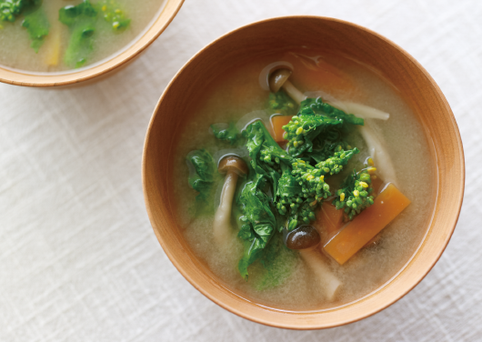 菜の花のほろ苦さが春の訪れを感じさせる味噌汁です。