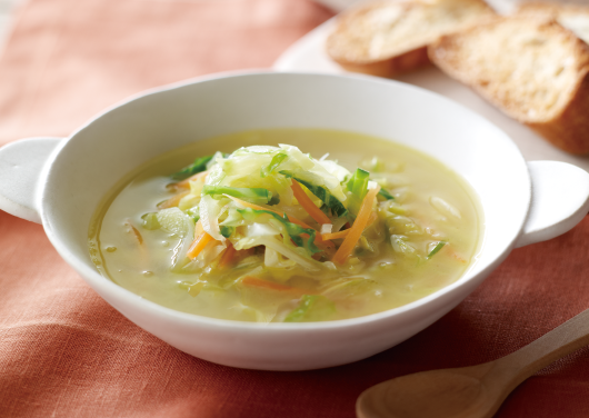 千切り野菜を炒めるのが時短のポイント。バターが香る甘みたっぷりのスープです。