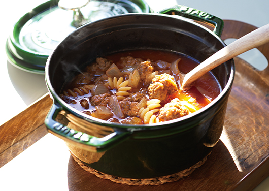 ・肉とだしだけで練り合わせた後に、パン粉、牛乳を加えるとジューシーに仕上がります。 ・ミートボールはゴツッと凹凸がある方が味が染みます。 ・ショートパスタはお好みのもので。乾燥パスタのまま加えます。