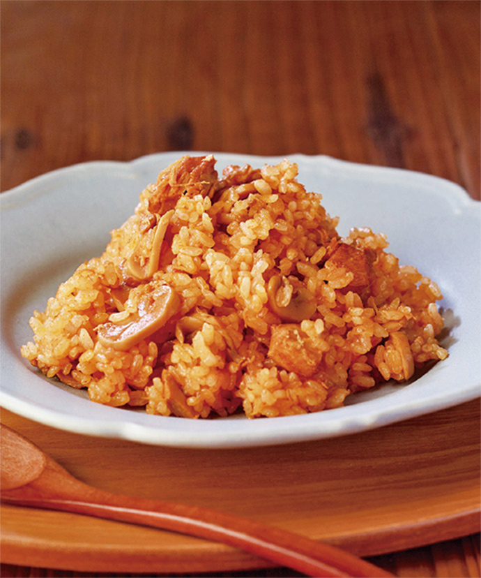 炊き込むだけの手軽さで具もたっぷり。一品で満足感があるので昼ごはんや弁当に。オムライスにアレンジしても。