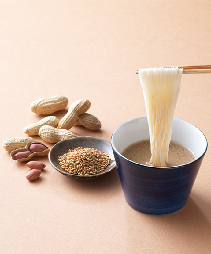 夏に何度も食べる素麺は楽しみ方も多彩に。鰹だしベースの胡麻香るコク深いつけだれは、水で希釈するだけで便利。