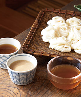 5種のだし素材をふんだんに使用した素麺つゆは、麺によく絡み、素麺が一層おいしく。すっきりした甘さで、ぶっかけもおすすめ。