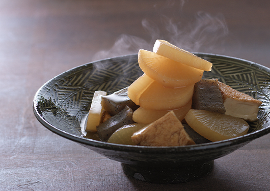 だしつゆを希釈すれば、それだけで煮物のつゆに。煮汁が少なくなるまで煮て、具に味を染み込ませます。