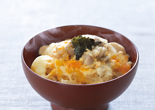 多めのつゆで具材を煮たら、卵でとじて完成。白だしのうまみがきいた親子丼です。